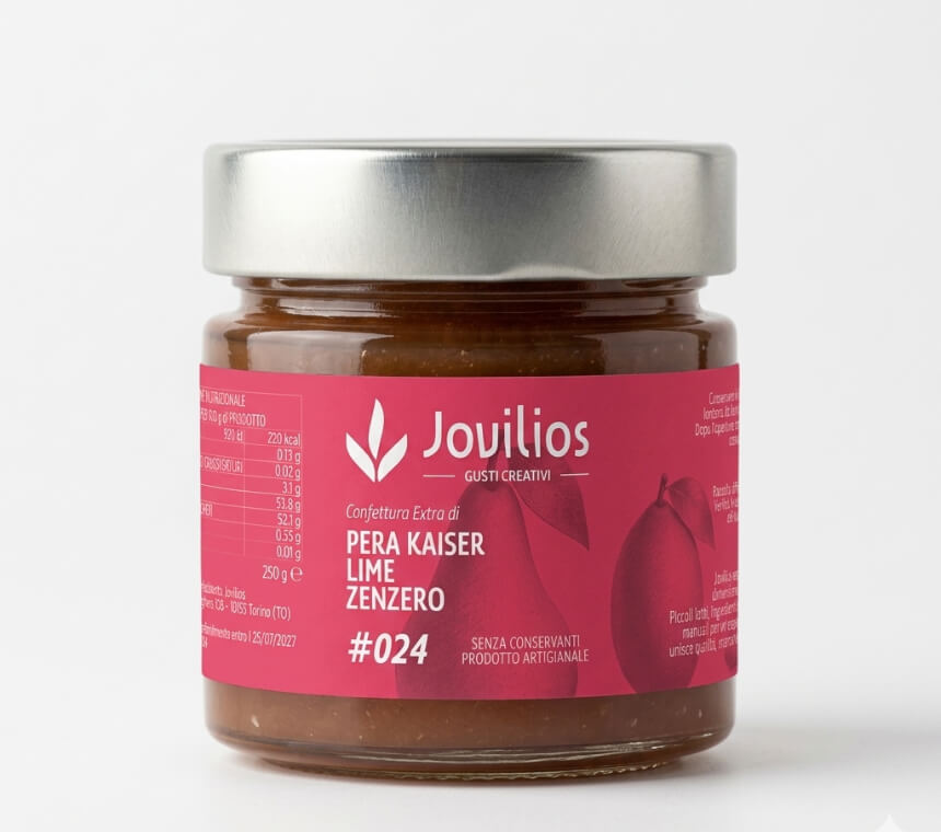 dettaglio etichetta Jovilios dal design pulito su conserva artigianale
